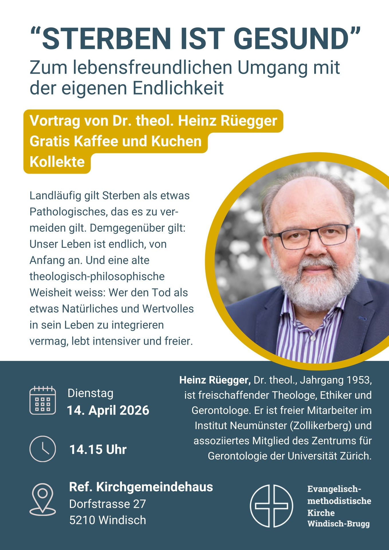 Am 14. April 2026 spricht der Theologe, Ethiker und Gerontologe Dr. Heinz Rüegger im Kirchgemeindehaus Windisch darüber, wie wir zu einem lebensfreundlichen Umgang mit der eigenen Endlichkeit finden. Seine Erfahrung ist: Wer den Tod als etwas Natürliches und Wertvolles in sein Leben zu integrieren vermag, lebt intensiver und freier. Ein sachkundiger Vortrag (nicht nur für Senioren) mit anschl. Kaffee und Kuchen. Herzliche Einladung!