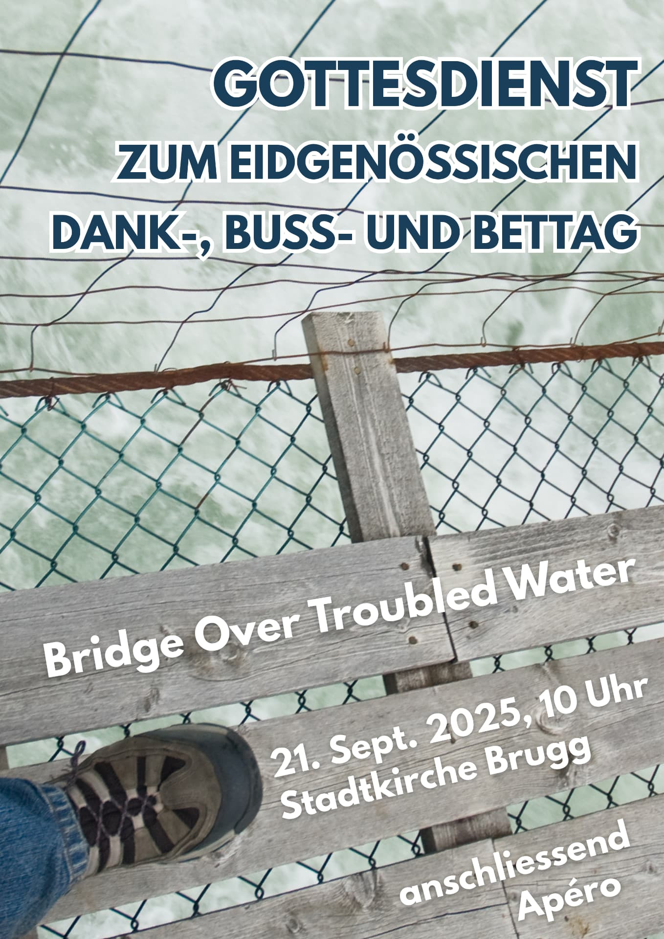 «Bridge over troubled water» (Brücke über unruhigen Gewässern), das bekannte Lied des US-amerikanischen Duos Simon & Garfunkel, spricht die Sehnsucht vieler Menschen nach Trost und Ermutigung in schweren Zeiten an. Angesichts von Konflikten, Sorgen um die Wirtschaftslage und Umweltbedrohungen suchen die Menschen Halt und brauchen Brücken, um aus ihrer Angst herauszukommen. Vor dem Hintergrund, dass die Kirchen zwar nicht den Weltfrieden bieten, aber immerhin zum inneren Frieden beitragen können, indem sie Hoffnung und ein Gefühl der Verbundenheit schenken, laden sie am Bettag, am 21. September 2025 um 10 Uhr in der reformierten Stadtkirche Brugg die Bevölkerung dazu ein, über dieses Brücken-Bauen und -Begehen nachzudenken. Der Name und das Wappen der Stadt Brugg, eine Brücke, passen ganz ausgezeichnet zum Thema des diesjährigen Bettags. Auch wird Frau Yvonne Buchwalder als Vertreterin des Stadtrats ihre Gedanken zu diesem Thema in einem Interviewgespräch in der Feier mit den Anwesenden teilen.